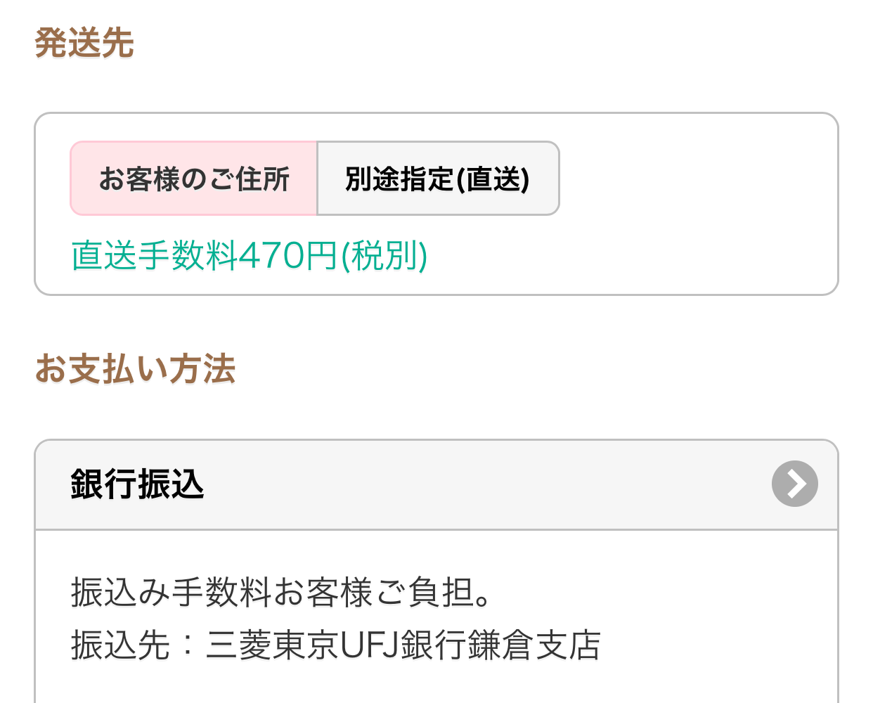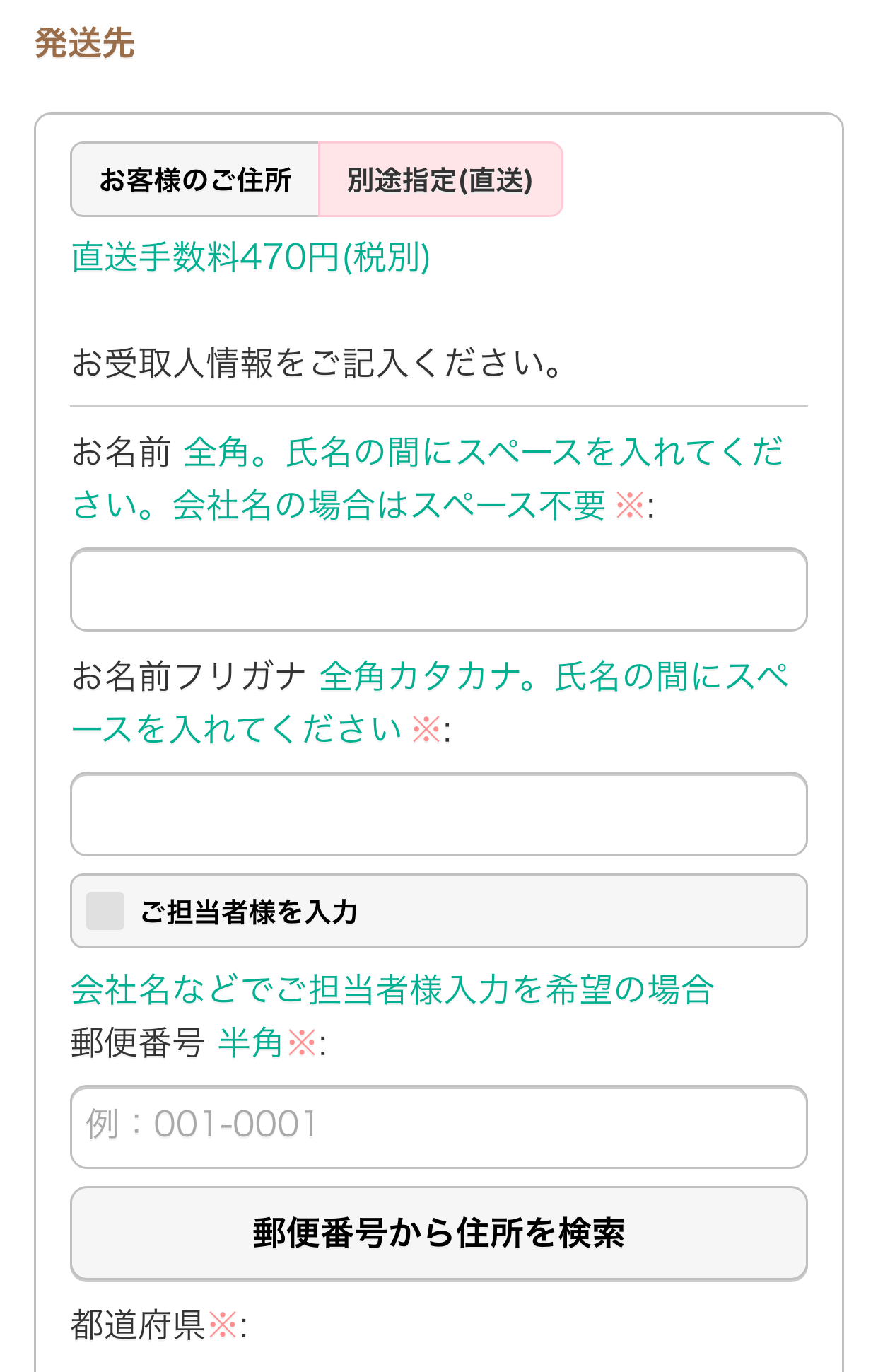 直送を指定するには、お客様情報入力画面の、「発送先」で「別途指定」をお選びください。この場合、表記されている直送手数料が別途かかります。