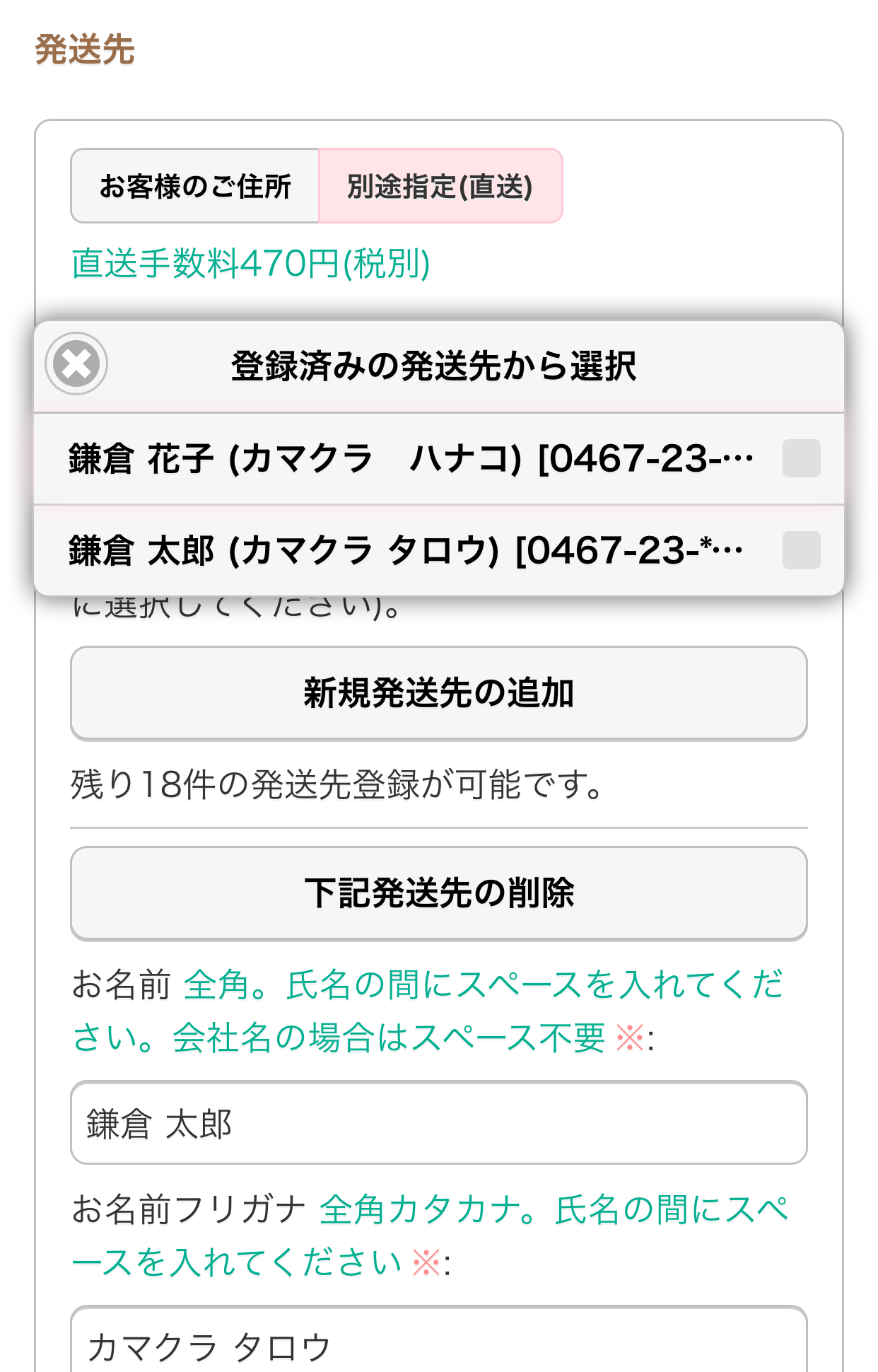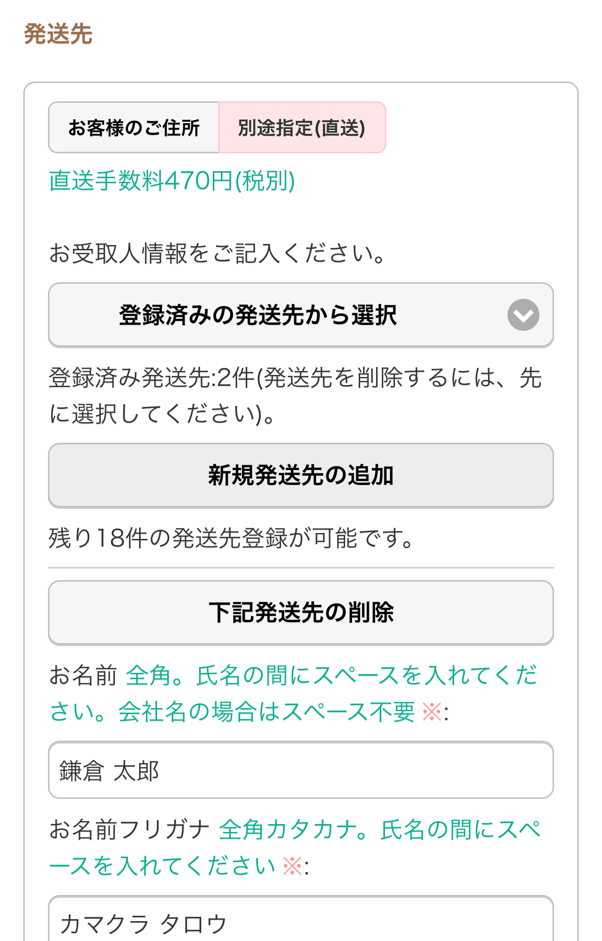 - 発送先(直送先)はお一人20件まで登録が可能です。