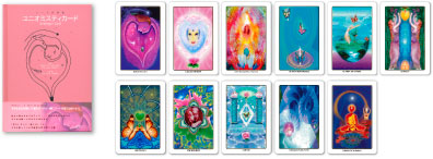 美しい11枚のカードが入った、解説書です。ここにはユニオミスティオイルに関する説明の他に、それぞれのチャクラの説明や、このカードを使ったいくつかのリーディングの方法、また、それぞれのオイルの特徴やメッセージ、オイルにどんな製油がつかわれているか、どのような石のエネルギーが入っているかなどの詳細がすべて書かれています。